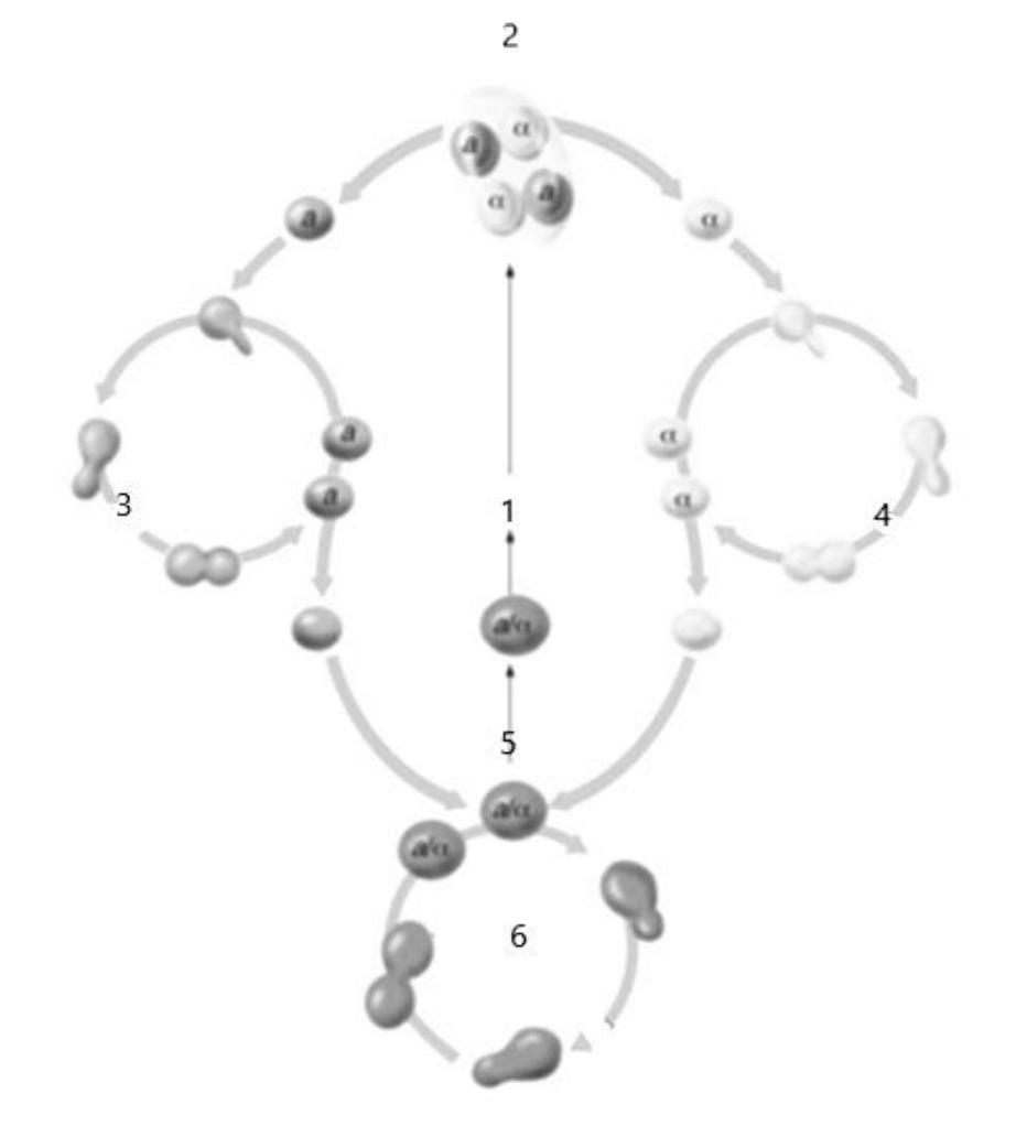 Рассмотрите рисунок жизненного цикла гриба Saccharomyces cerevisiae и установите соответствия между стадиями жизненного цикла (1-6) и названиями стадий. Одна и та же стадия может встречаться несколько раз, некоторые стадии могут быть лишними.