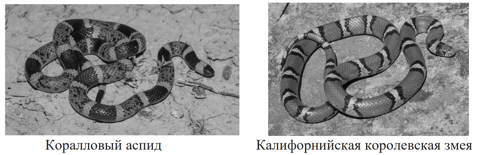 Живущие в Центральной и Южной Америке ядовитые коралловые аспиды (род Micrurus) и неядовитые королевские змеи (род Lampropeltis) имеют яркую поперечно-полосатую окраску сходного рисунка.