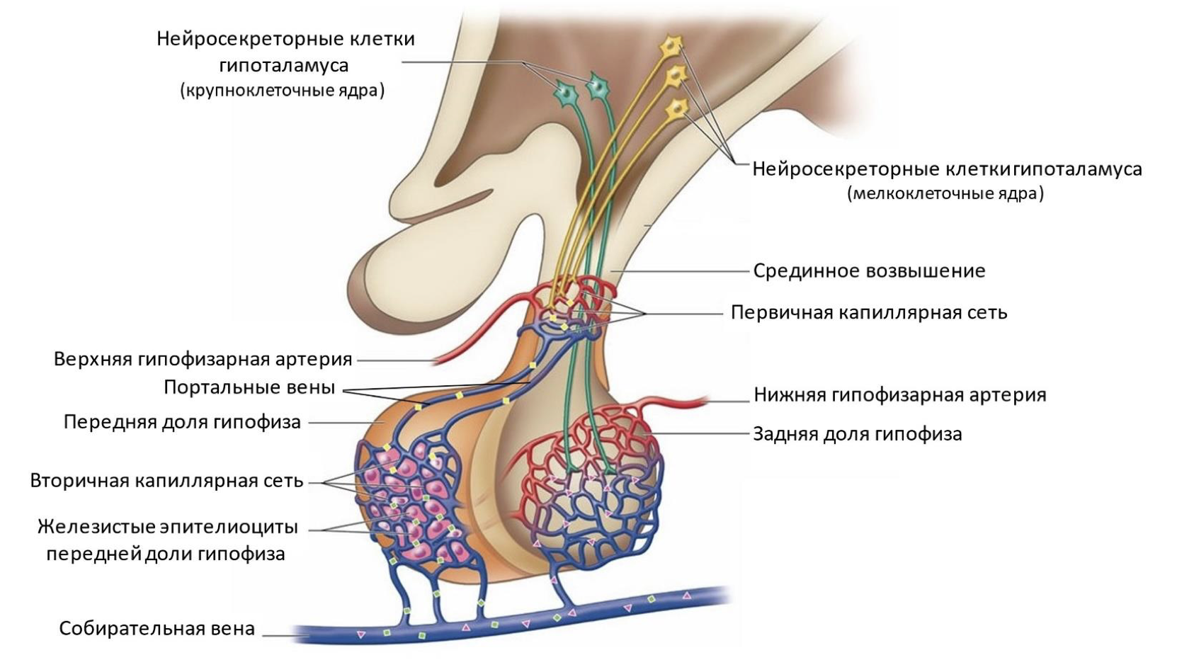 Внимательно изучите приведенный ниже рисунок, иллюстрирующий анатомические взаимоотношения гипоталамуса и долей гипофиза, и определите верные утверждения: