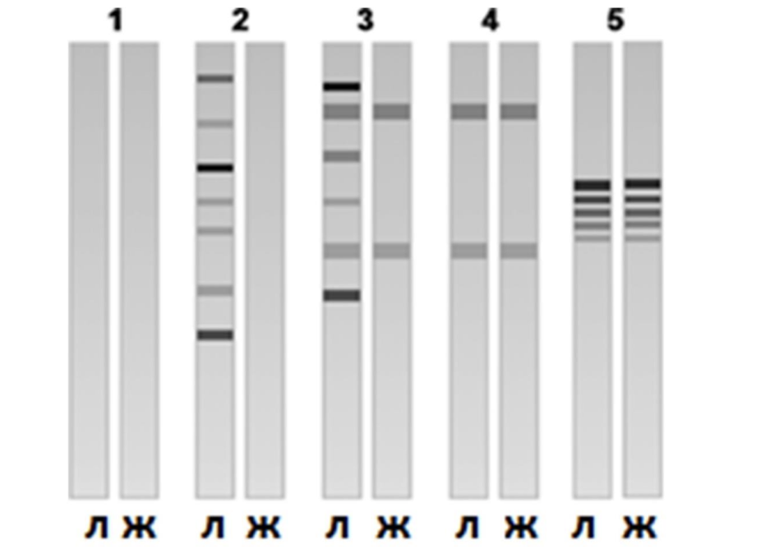 Для диагностики некоторых заболеваний, ассоциированных с иммунным ответом организма, используют метод изоэлектрофокусирования антител (иммуноглобулинов класса G – IgG) в церебро-спинальной жидкости (ликворе – Л), омывающей структуры ЦНС, а также в плазме (жидкой неклеточной части крови – Ж): под действием электрического поля белки-иммуноглобулины двигаются в pH-градиенте внутри специального геля до тех пор, пока не достигнут положения, в котором они приобретут суммарный поверхностный нулевой заряд. Чем больше доля моноклональных антител (распознающих один специфический антиген в результате активированного В- клеточного иммунного ответа) в ликворе или плазме, тем интенсивнее будет визуализироваться соответствующая им темная полоса после изоэлектрофокусирования. Выделяют 5 основных типов секреции антител по результатам изоэлектрофокусирования: