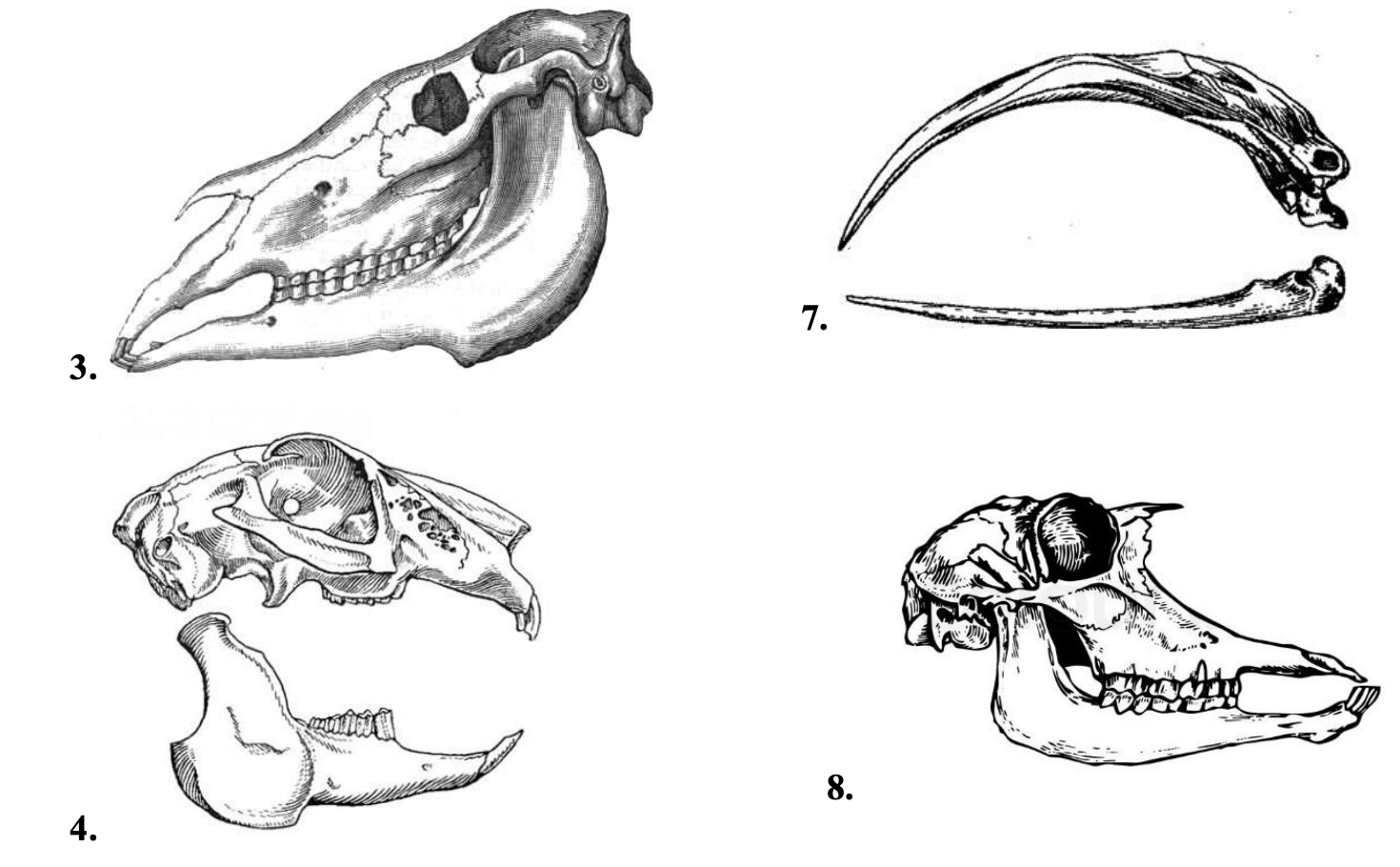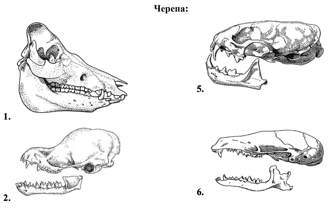Сопоставьте, к каким отрядам относятся млекопитающие, черепа которых изображены на рисунках (1-8). Представители одного и того же отряда могут встречаться несколько раз, а некоторые отряды могут быть не представлены на рисунке.