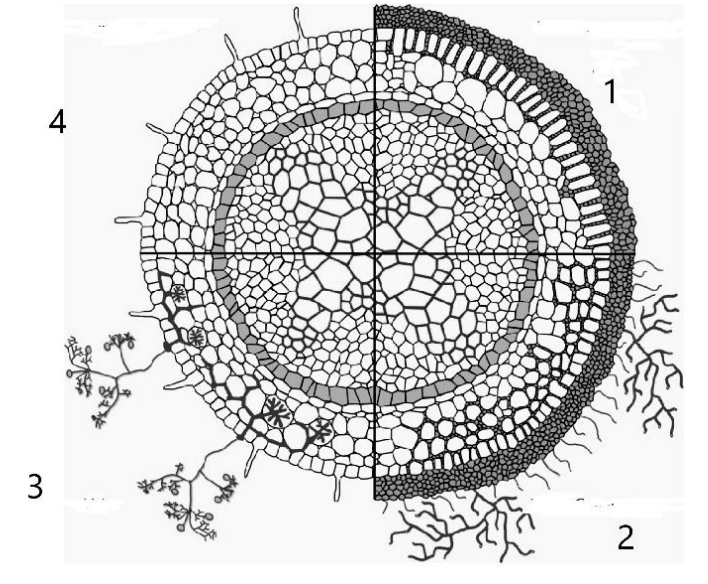 Микориза (грибокорень) — симбиотическая ассоциация мицелия гриба с корнями высших растений. Соотнесите цифры на диаграмме срезов корней с отсутствием или наличием основных типов микориз.