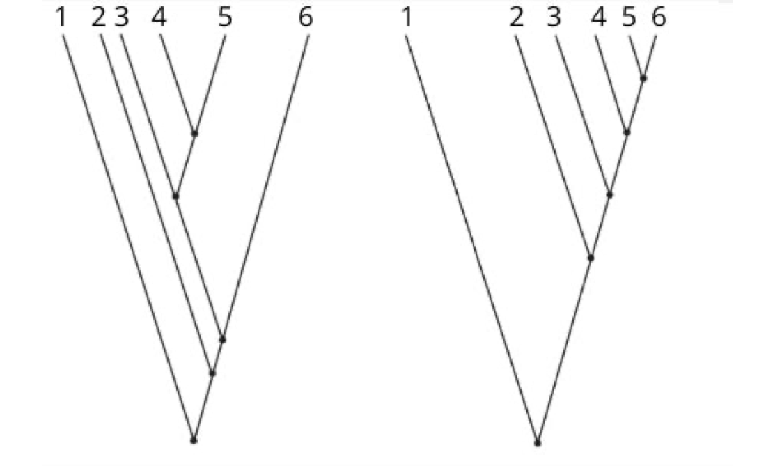 Кладограммы можно создавать путём сравнения как нуклеотидных последо- вательностей ДНК, так и аминокислотных в белках, причём не всегда результаты анализа совпадают (см., например, рисунок). Почему основанные на последо- вательностях ДНК кладограммы оказываются более надёжными для реконструкции филогенетического родства видов?