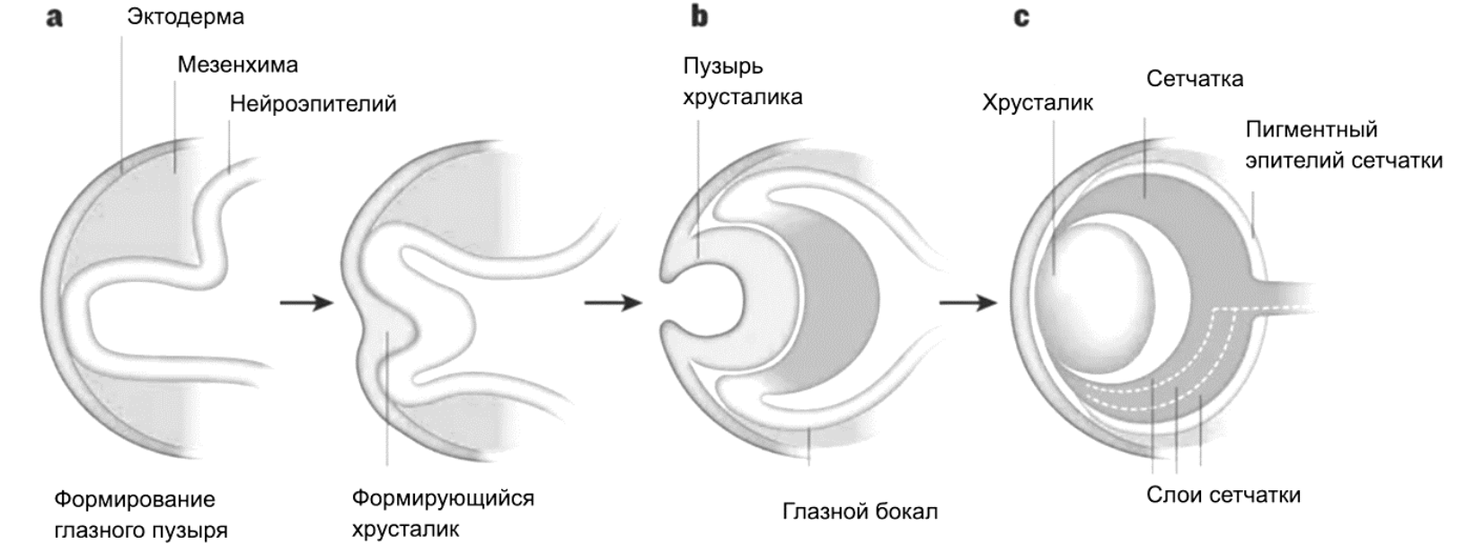 Ниже на рисунке показана схема формирования глаза у млекопитающего в эмбриогенезе: