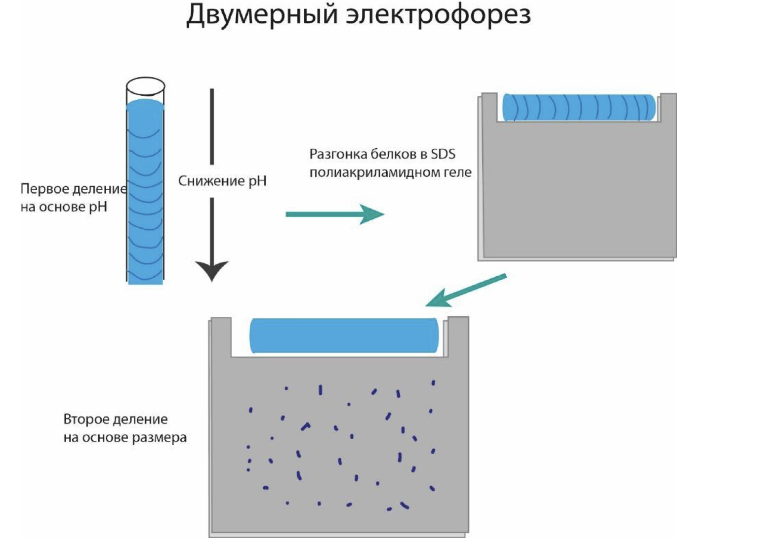 Во многих биохимических лабораториях используют метод двумерного белкового электрофореза, схема которого представлена на картинке ниже.