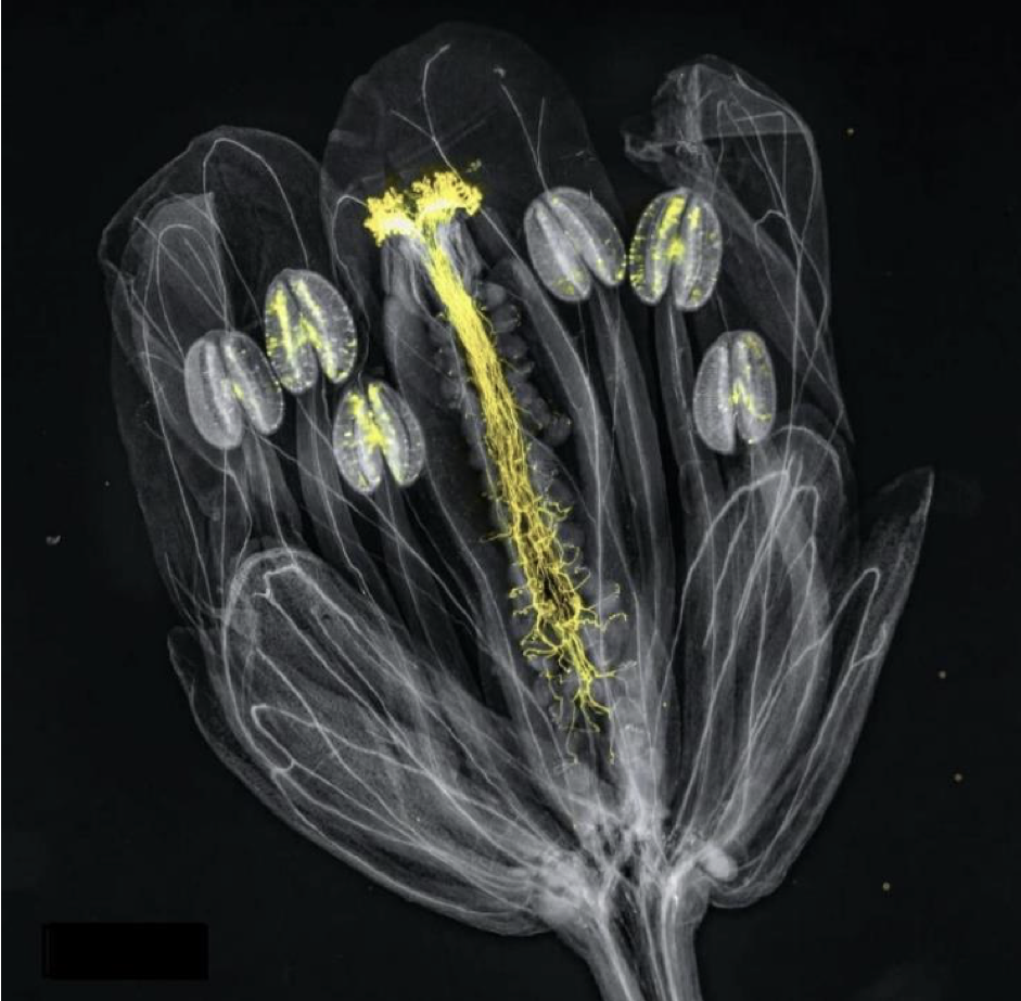 В цветке модельного растения Arabidopsis thaliana при использовании красителя анилинового синего в поле зрения флуоресцентного микроскопа будет видно изображение, показанное ниже. Анилиновый синий связывается со специфическим для растений полимером глюкозы в клеточной стенке – каллозой. Внимательно рассмотрите изображение, определите, какие структуры окрашены анилиновым синим (жёлтая флуоресценция на микрофотографии), и выберите верное утверждение об этих структурах.