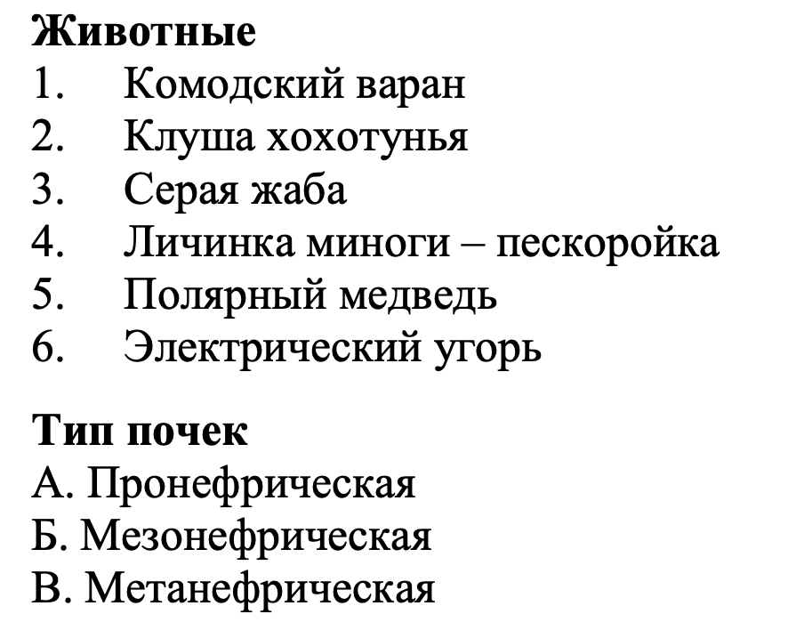 Для позвоночных животных характерно разнообразие строения почек. Так, традиционно выделяют три типа почек: пронефрическую, мезонефрическую и метанефрическую. Сопоставьте названия животных (стадий развития животных) и тип почки, который для них характерен.