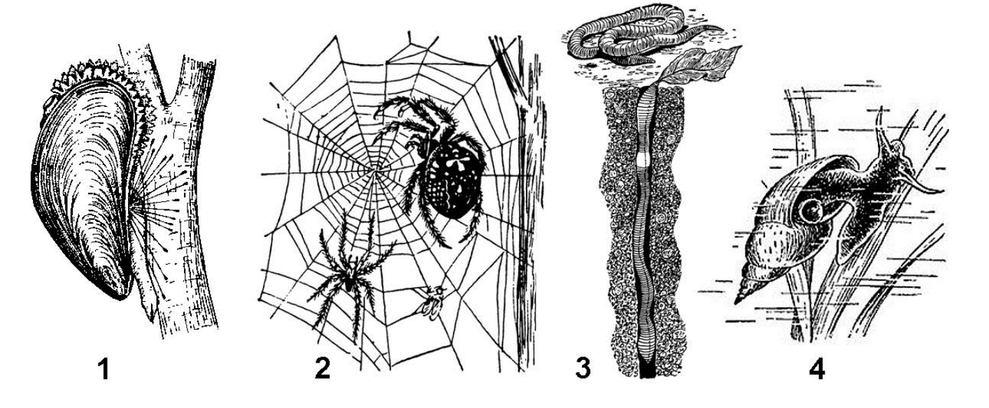 Среди изображённых животных (1 – 4) кровеносную систему незамкнутого типа с трёхкамерным сердцем имеют: