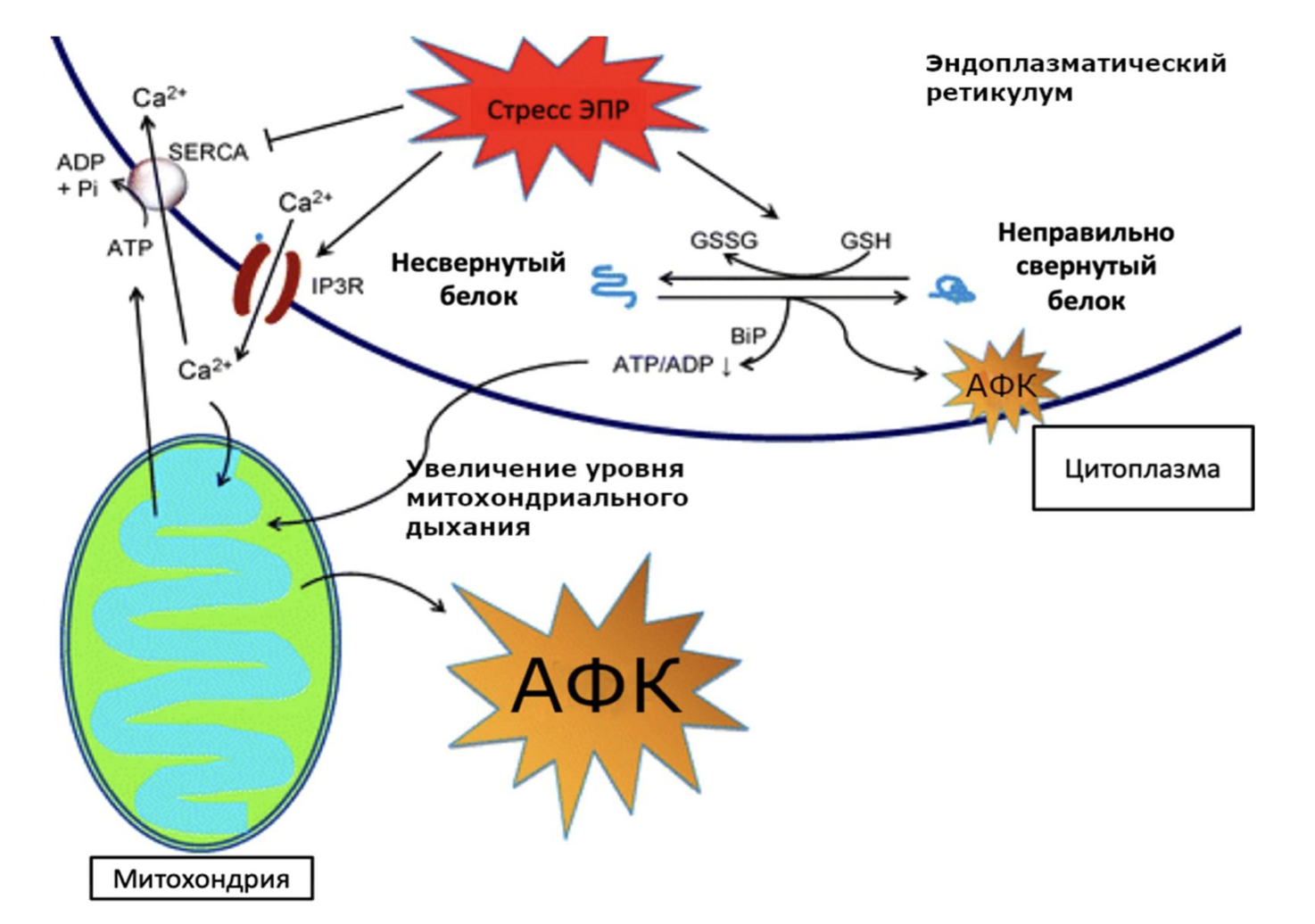 Обозначения: IP3R – рецептор к инозитолтрифосфату, BiP – белок-шаперон в ЭПР, SERCA – Ca2+-сакро/эндоплазматическая АТФаза, АФК – активные формы кислорода, GSH – восстановленный глутатион,GSSG – окисленный глутатион, ADP – аденозиндифосфат, ATP – аденозинтрифосфат, Pi – фосфат-анион.
