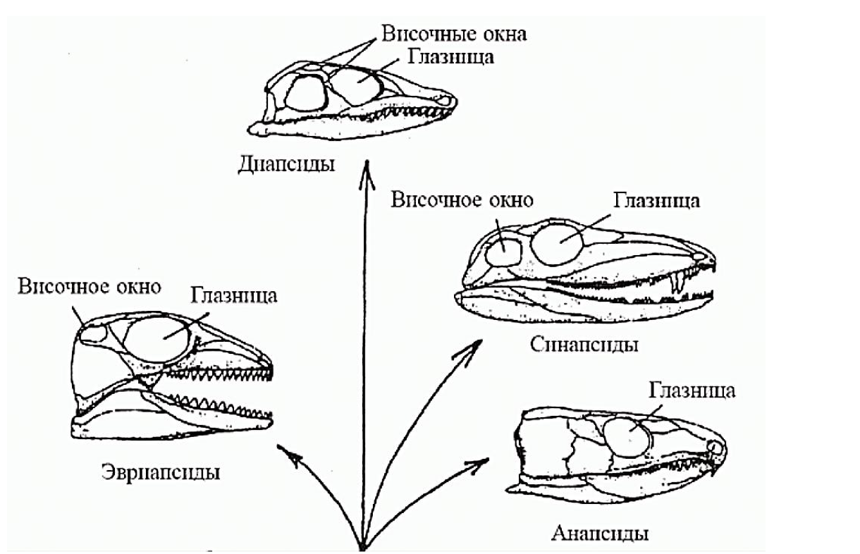 Первое время после выхода на сушу череп позвоночных животных был покрыт сплошной крышей из костей и являлся массивным образованием. В различных группах позвоночных животных в черепе сформировались височные окна для более удобного крепления жевательной мускулатуры и облегчения всей конструкции. В зависимости от наличия или отсутствия височных окон и их количества выделяют несколько типов строения черепа