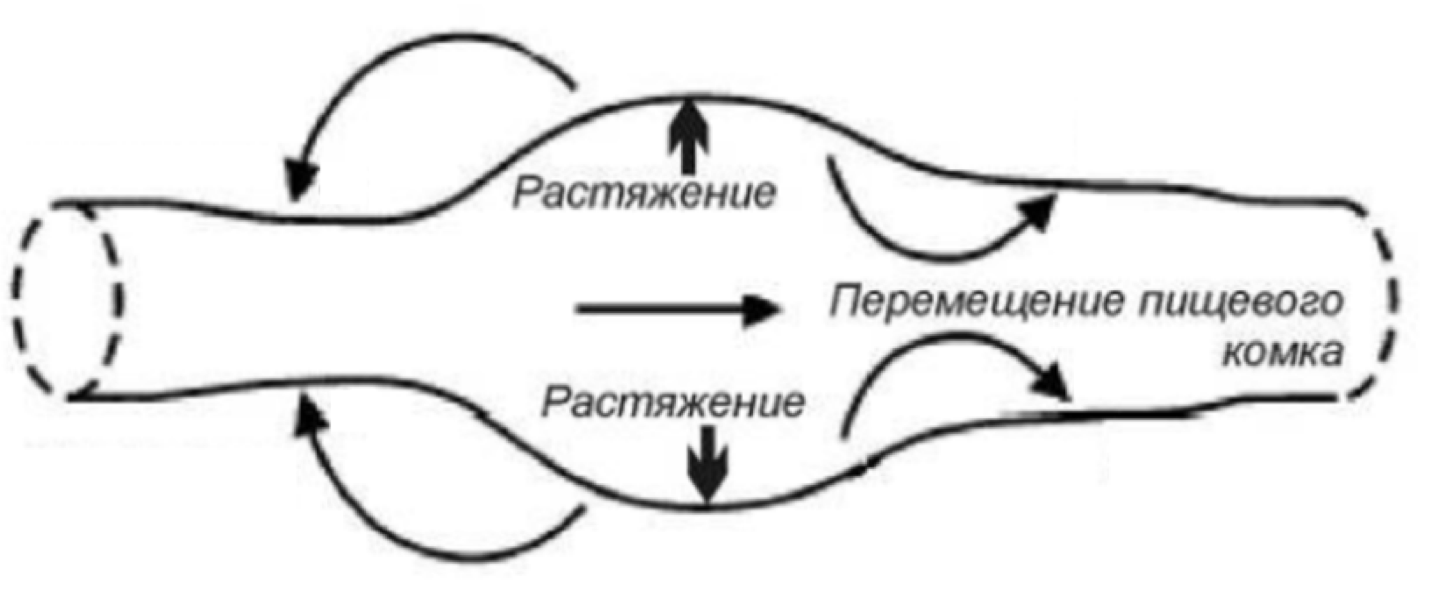 На рисунке изображена схема работы перистальтики кишечника. Согласно этой схеме, растяжение определённого участка кишечника запускает рефлекс, приводящий к: