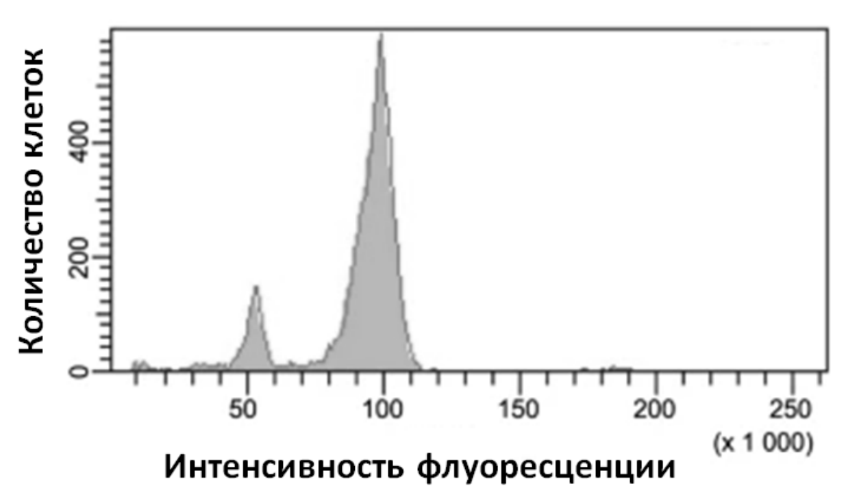 При изучении клеточного цикла используют метод проточной цитофлуориметрии. Данный метод позволяет оценить количество ДНК в клетке путем детекции флуоресцентного сигнала от красителя, связывающегося с ДНК. Изучите представленный результат эксперимента по анализу культуры клеток и выберите утверждение, которое можно сделать, исходя из результата эксперимента: