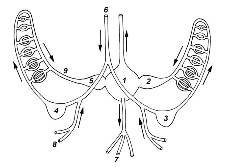 Рассмотрите схему кровообращения в центральных отделах кровеносной системы головоногого моллюска (вид со спинной стороны). Выберите все верные утверждения: