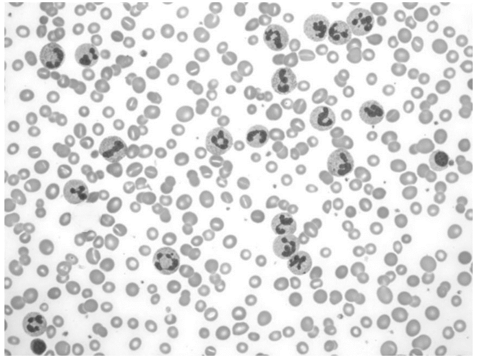 На иллюстрации представлен мазок крови. Подсчитайте, сколько в нем разных типов клеток и выберите верный ответ.