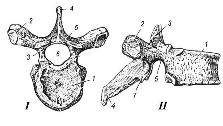 На рисунке показано строение грудного позвонка млекопитающего (I — вид сверху; II — вид сбоку). Сопоставьте указанные на рисунке структурные части (1-7) с их названиями, а также укажите, с какой стороны показан вид сбоку на рис II: