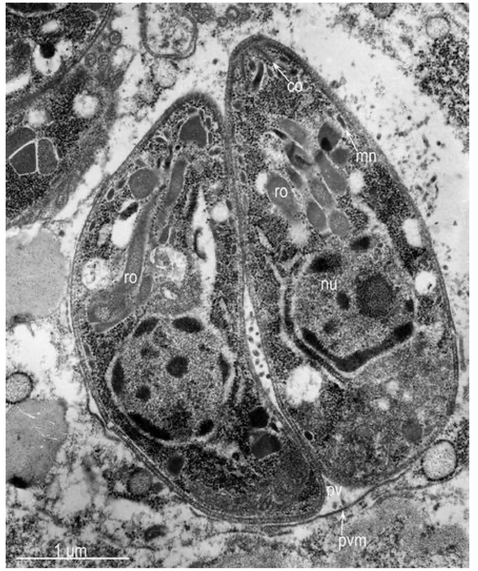 Рассмотрите микрофотографию токсоплазмы и выберите все верные утверждения.