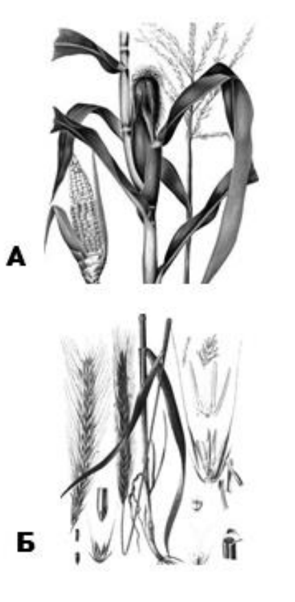 Подберите к каждому виду растений (А и Б), изображенных на рисунке, соответствующие характеристики.