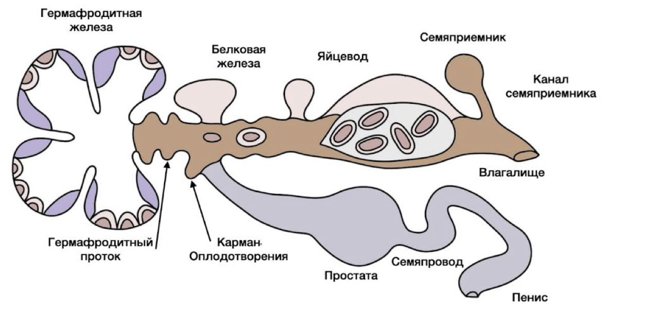 На рисунке представлена схема строения половой системы у некоторых наземных брюхоногих моллюсков. Выберите верные утверждения относительно процесса размножения таких моллюсков.