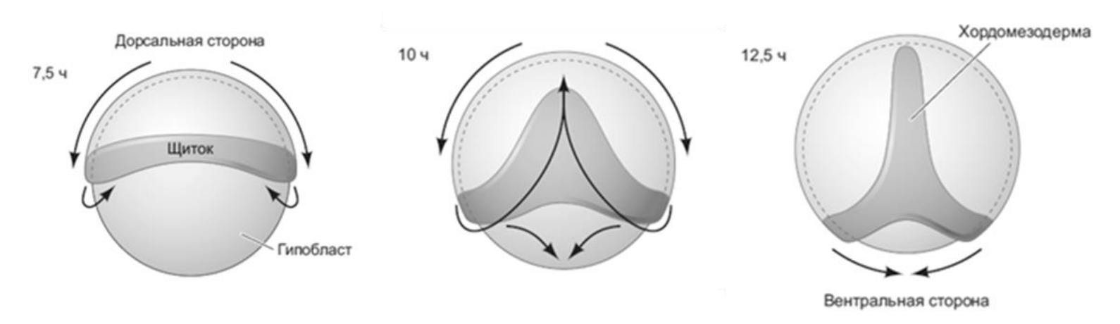 Выделяют несколько основных типов гаструляционных движений: эпиболия (обрастание), инвагинация (впячивание), инволюция (подворачивание), ингрессия (выселение), деламинация (расслоение), интеркаляция (встраивание), конвергенция (растяжение). На рисунке представлены последовательные стадии формирования мезентодермы у зародыша костной рыбы Danio rerio – излюбленного лабораторного объекта. Выберите ту комбинацию клеточных движений, которая соответствует последовательно (слева – направо) изображенным процессам: