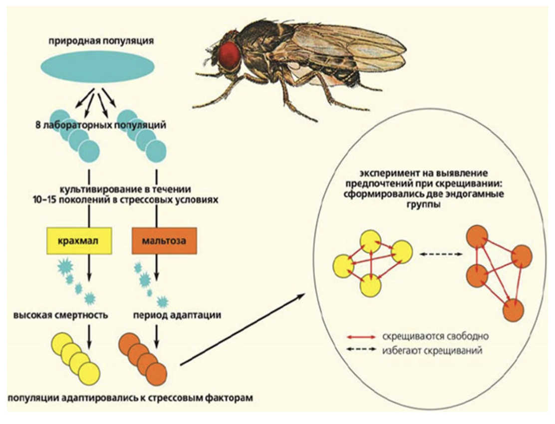 Перед вами схема эксперимента. Лабораторные популяции плодовой мушки (Drosophila melanogaster) выращивались в различных условиях в течение достаточно большого числа поколений. Затем тестировались их половые предпочтения: особям предоставлялся выбор при скрещивании.