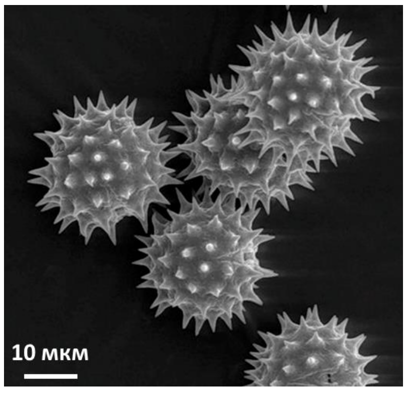 Фотография, полученная с помощью сканирующего электронного микроскопа, содержит информацию о поверхности некоторых структур, образованных растением. Узнайте их и укажите то, что находится внутри: