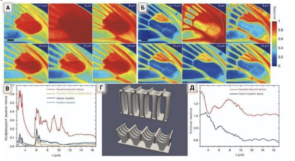 В жарких условиях многие животные придумали различные приспособления для того, чтобы бороться с перегревом, бабочки – не исключение. Многие из них используют систему гемолимфы крыла для охлаждения организма. На картинке ниже представлен анализ спектра эмиссии (испускания) тепла крыльями бабочек, покрытых чешуйками. Красной чертой на графике показан спектр эмиссии чешуек в области пахучего органа, жёлтой – в области "сердца" крыла, чёрным – в области крыла, окрашенной в чёрный цвет, голубым – в области крыла, окрашенной в голубой цвет. На картинках А и Б представлен спектр инфракрасного излучения крыльев, покрытых чешуйками (картинка А) и не покрытых чешуйками в области, выделенной пунктирной линией (картинка Б). Проанализируйте представленные данные и, основываясь на них, выберите верное утверждение.