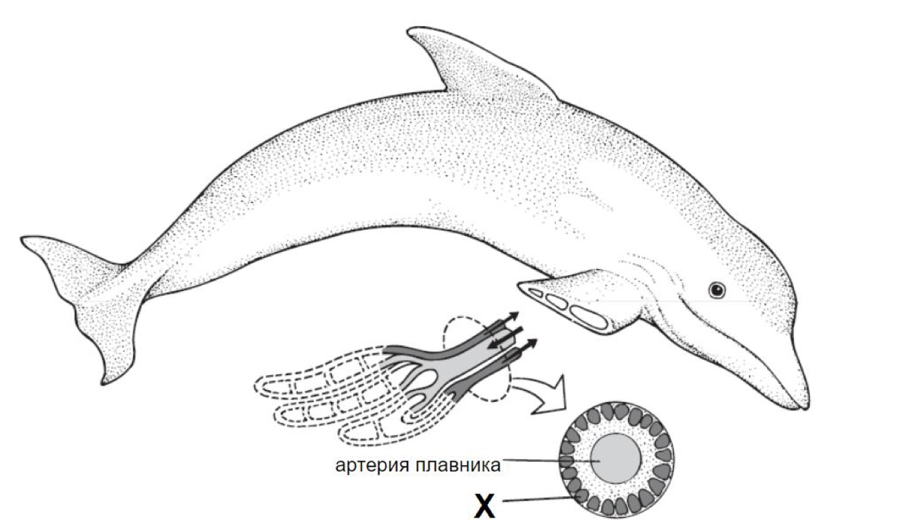 Проблема терморегуляции и поддержания постоянной температуры особенно остро стоит перед теплокровными животными, обитающими в водной среде. Одним из решений становится минимизация потерь тепла через выступающие части тела. На рисунке ниже представлена схема кровеносного русла плавника дельфина, вкотором реализован один из возможных механизмов сохранения тепла. Какие структуры на данной схеме обозначены указателем X?