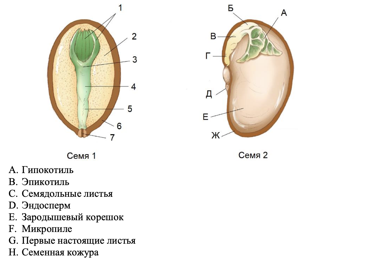 На рисунке представлены схемы строения семян, принадлежащих растениям разных отделов. Установите соответствие между структурами семени 1, изображённого слева (1–7), и семени 2, изображённого справа (А–Ж), а также с названиями данных структур (A–H). Поставьте "Х", если какая-то из структур в семени отсутствует.