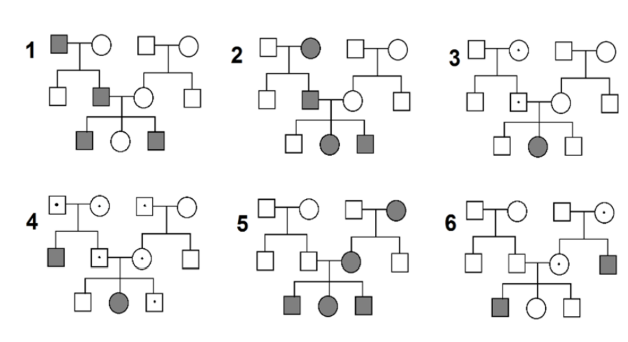 Установите соответствие между родословными на рисунке (1–6) и механизмами наследования выделенного серой заливкой признака. Гетерозиготные носители, не имеющие проявлений признака, отмечены точками.