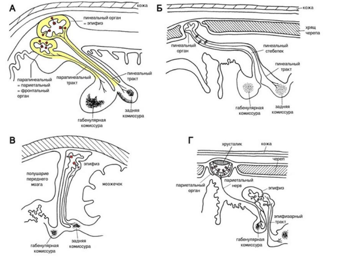 Рассмотрите продольный разрез в области теменных глаз у миноги (А), акулы (Б), птицы (В) и ящерицы (Г) и выберите НЕВЕРНОЕ утверждение.