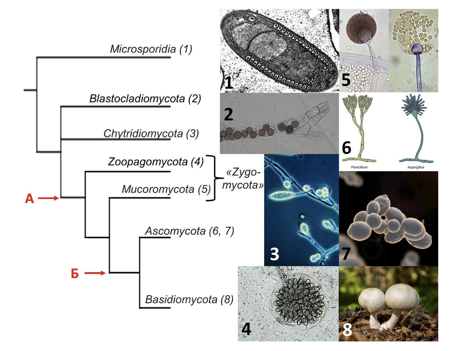 Грибы – это группа гетеротрофных эукариотических организмов, обладающих хитиновой клеточной стенкой и осмотрофным способом питания. Положение грибов в системе живого неоднократно менялось: изначально грибы были отнесены Карлом Линнеем к растениям, позднее они были выделены в отдельное царство, а в последнее время ряд грибоподобных организмов оказались исключенными из данного царства в силу отсутствия родства с «обычными» грибами. Объем царства Грибы и его подразделение на группы остается дискуссионным. На рисунке приведено филогенетическое древо, иллюстрирующее современные представления о родстве некоторых отделов грибов, а также внешний вид некоторых представителей этих отделов: 1 – Fibrillanosema crangonycis G.M. Johanna, S. Galbreath, J.E. Smith, R.S. Terry, J.J. Becnel & A.M. Dunn., 2 – Allomyces sp., 3 – синхитрий внутриживущий (Synchytrium endobioticum (Schilb.) Percival) – возбудитель рака картофеля, 4 – Rhopalomyces elegans Corda, 5 – мукор (Mucor sp.), 6 – пеницилл (Penicillium sp.), 7 – пекарские дрожжи (Saccharomyces cerevisiae Meyen ex E.C.Hansen), 8 – шампиньон двуспоровый (Agaricus bisporus (J.E.Lange) Imbach). Систематическая принадлежность представителей грибов указана в скобках после названия таксона на филогенетическом древе. Буквы А и Б обозначают некоторые значимые эволюционные события, которые произошли в ходе филогенеза грибов. Проанализируйте представленную схему и укажите верные утверждения: