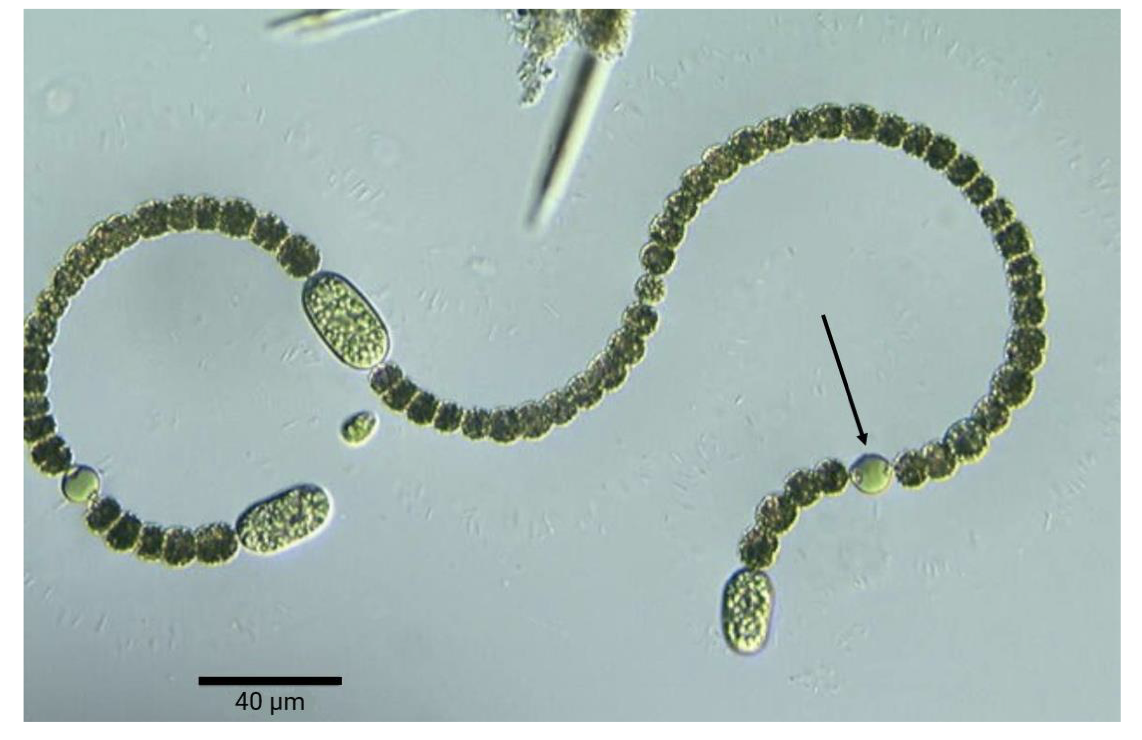 На картинке изображена цианобактерия. Стрелкой отмечена некая структура, имеющая утолщённую клеточную стенку и не имеющая фотосистемы II. Какую функцию может выполнять эта структура?