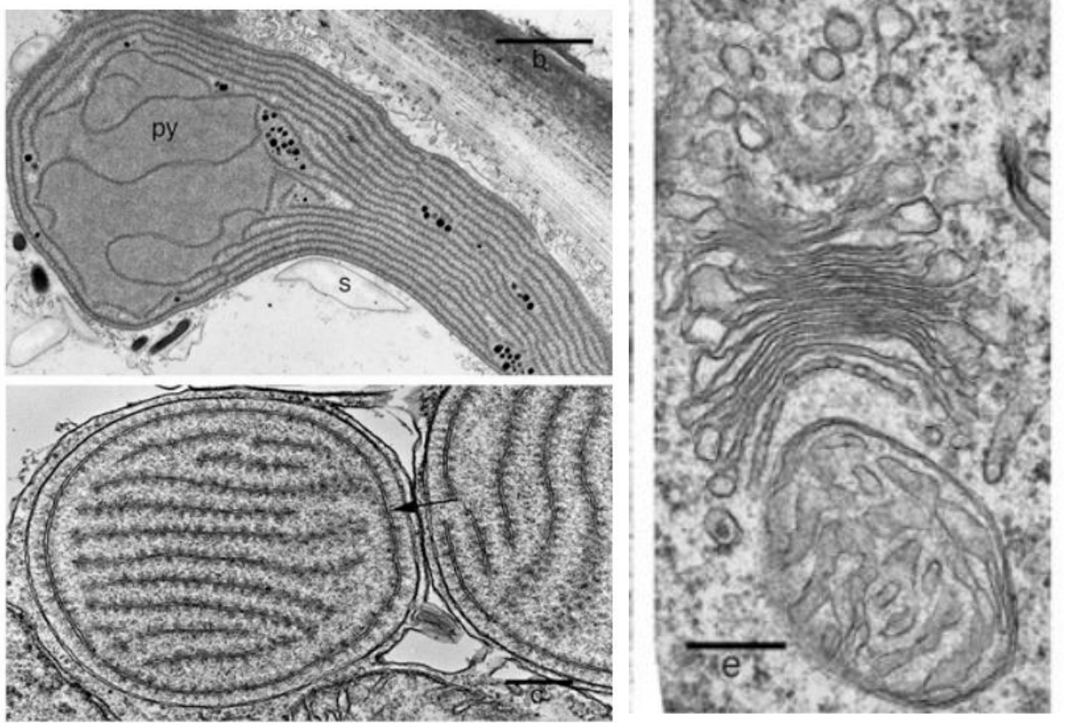 На электронных фотографиях показаны фрагменты клеток водорослей из одного отдела. Определите, к какому отделу они относятся, исходя из того, какие структуры видны на микрофотографиях: