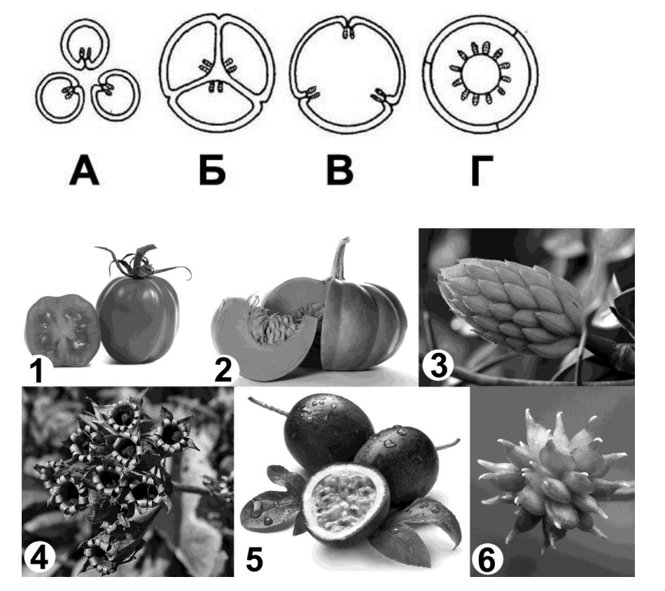 На верхнем рисунке изображены схемы основных типов гинецея (их названия приведены ниже). Укажите в виде соответствия букв и цифр, каким типом гинецея образован каждый из представленных на фото плодов: