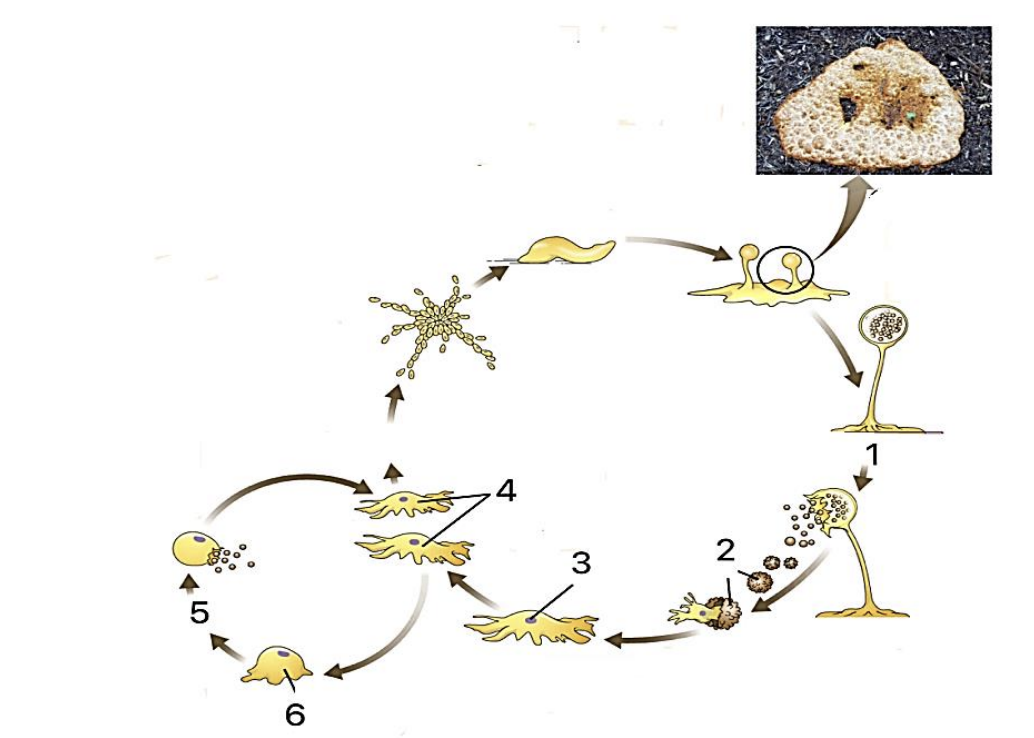 Рассмотрите схему жизненного цикла слизевика. Найдите диплоидные стадии развития