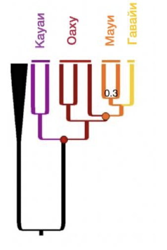 Гавайские острова формировались постепенно по мере движения над мантийным плюмом тихоокеанской тектонической плиты на северо-запад. В ходе этого процесса последовательно образовалось более 20 вулканических островов, из которых самым крупным является остров Гавайи. К северо-западу от островов, существующих по сей день, располагаются затопленные вулканы, некогда служившие местообитанием для животных и растений. На рисунке приведено филогенетическое дерево роскошных молей, являющихся эндемиками Гавайских островов. На основании данных рисунка выберите верное утверждение.