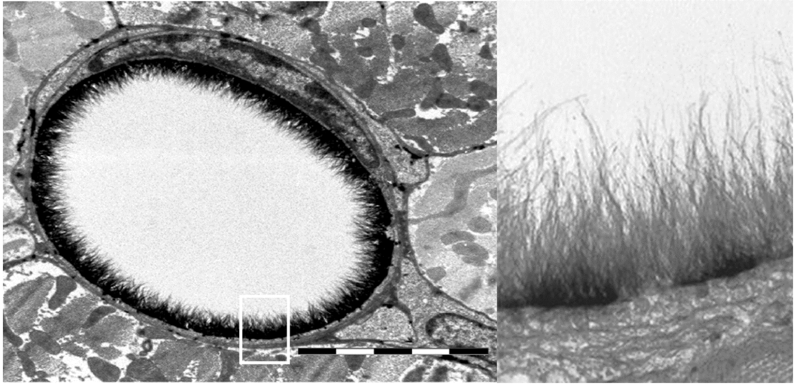 На рисунке показано изображение поперечного среза капилляра животного, полученное с помощью метода просвечивающей электронной микроскопии, а также увеличенный участок этого изображения. Масштабная линейка имеет размер 2 микрометра. На изображении видно, что изнутри капилляр покрыт нитевидными структурами, длина которых в несколько раз превышает толщину выстилающих капилляр клеток. Скорее всего, эти нитевидные структуры представляют собой: