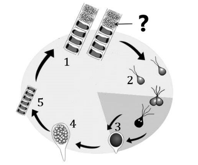 На рисунке изображена часть жизненного цикла зеленой водоросли улотрикс. Знаком вопроса (?) обозначены: