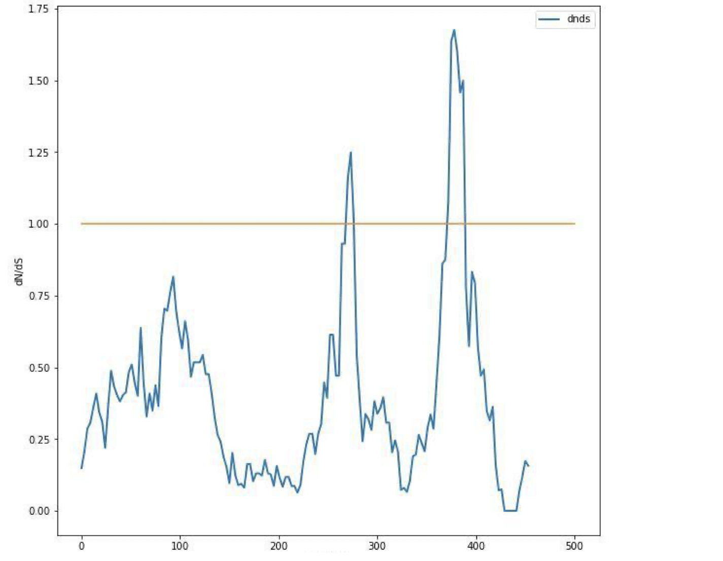 На графике показано значение соотношения несинонимичных мутаций (dN) к синонимичным (dS) в гене митохондриального белка в парном выравнивании. Для построения графика брали рамку в 45 нуклеотидов, которую сдвигали каждый раз на 3 нуклеотида. Рассмотрите график и выберите верные утверждения.