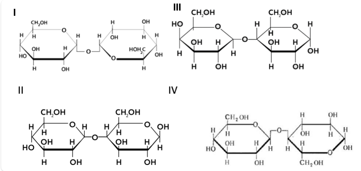 Углеводы (сахара) по химической природе представляют собой альдегидоспирты или кетоспирты. Свободные карбонильные группы (С=О) углеводов обладают редуцирующей (восстанавливающей) активностью, то есть способностью восстанавливать, например, двухвалентные катионы до одновалентных (Сu 2+ до Cu+ ), на чем основаны некоторые качественные реакции на редуцирующие сахара. На рисунках показаны формулы четырех распространенных дисахаридов. Какой из них НЕ является редуцирующим сахаром?