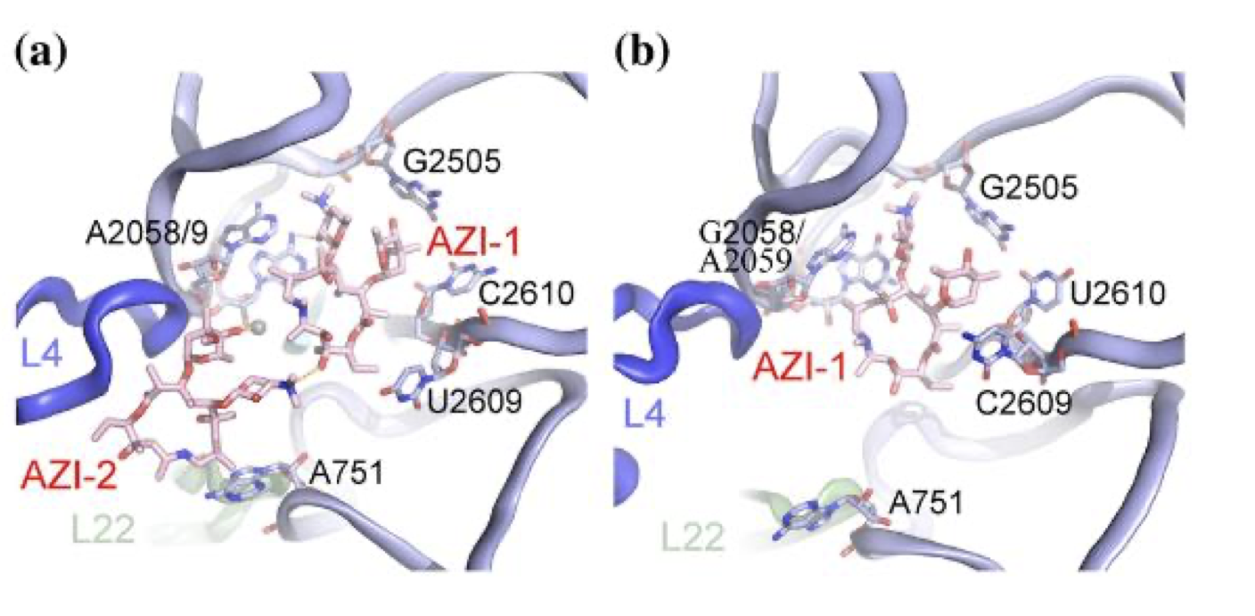 На схеме под буквами a и b представлено взаимодействие некоего антибиотика с определённой субъединицей рибосомы. Обратите внимание на различия между a и b и выберите наиболее вероятное объяснение этих различий.