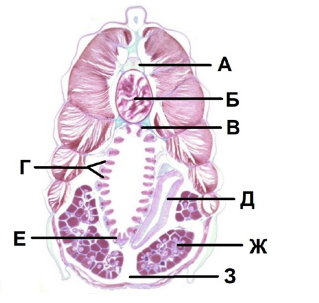 Укажите верные названия каждой из структур (А-З) на поперечном срезе ланцетника.