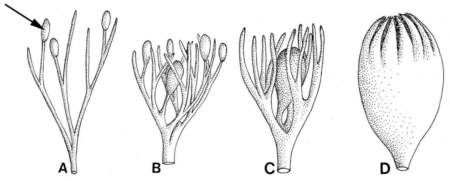 Структуру, указанную черной стрелкой, палеоботаники распознают как спорангий. А структуру под буквой D можно рассматривать как:
