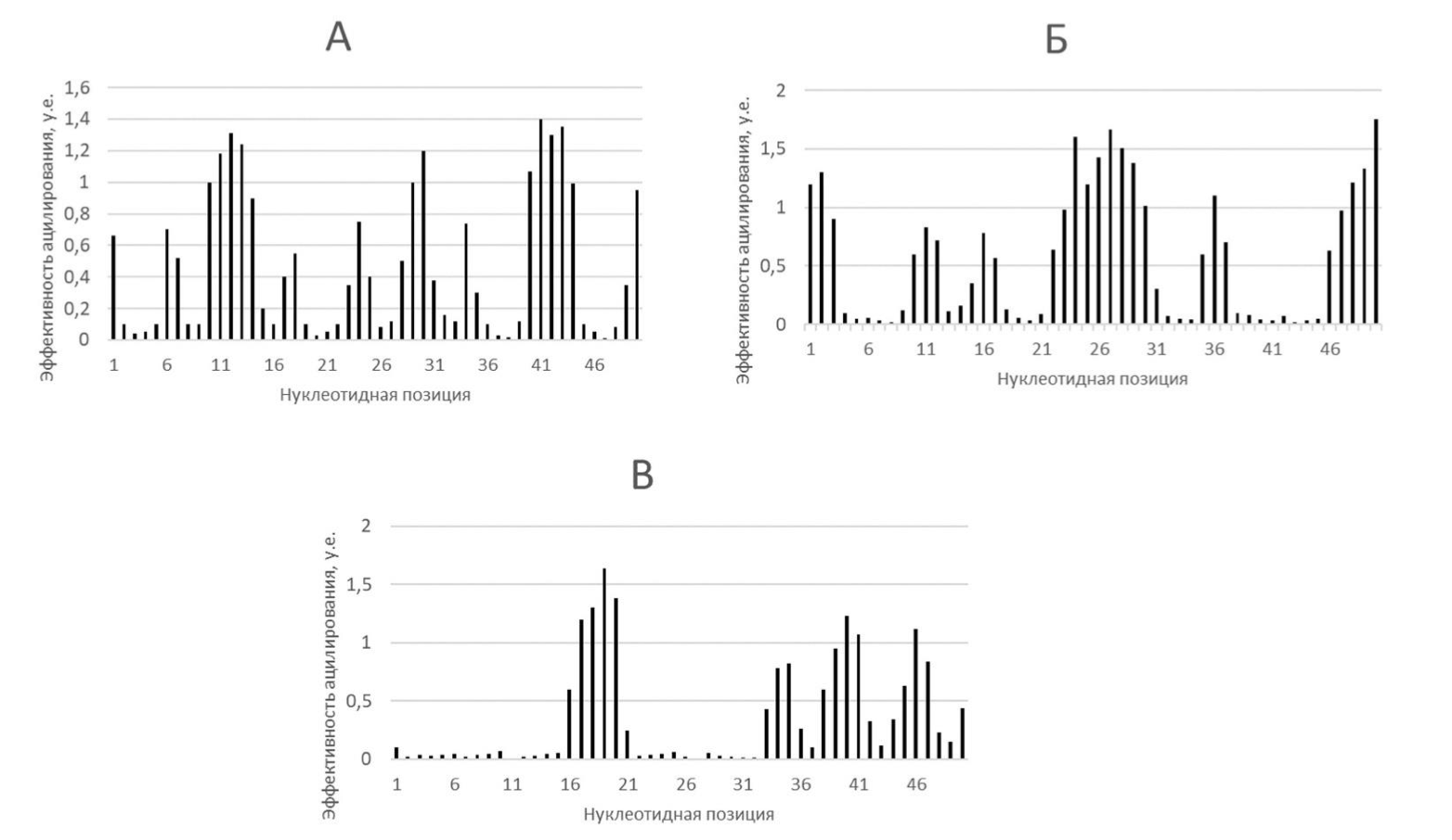Для анализа структуры молекул РНК используется метод SHAPE (от английского, Selective 2'-hydroxyl acylation analyzed by primer extension – селективное ацилирование 2'-гидроксила, анализируемое по удлинению праймера). Суть этого метода состоит в следующем. Молекулу РНК обрабатывают 1-метил-7-нитроизатоевым ангидридом, который ацилирует 2'-гидроксильную группу рибозы у нуклеотидных остатков, которые не образуют комплементарных взаимодействий в структуре данной молекулы РНК. Далее такую модифицированную молекулу РНК добавляют в реакцию обратной транскрипции с праймером, специфичным к 3'-концу исследуемой молекулы РНК. Ацилирование снижает эффективность прохождения обратной транскриптазы через модифицированные нуклеотиды. Далее продукты реакции обратной транскрипции анализируют путем количественного электрофореза в полиакриламидном геле с высокой разрешающей способностью. Соответственно, такая методика позволяет определить эффективность ацилирования разных нуклеотидов в составе молекулы РНК, а значит и оценить способность этих нуклеотидов формировать комплементарные взаимодействия в структуре этой молекулы РНК. На графиках А-В показаны профили ацилирования для трех различных молекул РНК длиной 50 нуклеотидов. Такие профили позволяют понять эффективность ацилирования (выраженную в условных единицах) для каждого нуклеотида в составе молекулы РНК. Ниже показаны вторичные структуры нескольких разных молекул РНК.