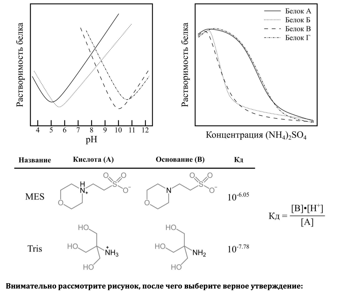 Каролина работает со смесями четырех белков – А (75 кДа), Б (26 кДа), В (72 кДа) и Г (24 кДа). Считайте, что 1 кДа соответствует 1000 г/моль. На рисунке показано, как растворимость данных белков зависит от pH раствора и концентрации сульфата аммония. Напоминаем, что pH = –lgС(H+), где C соответствует молярной концентрации.