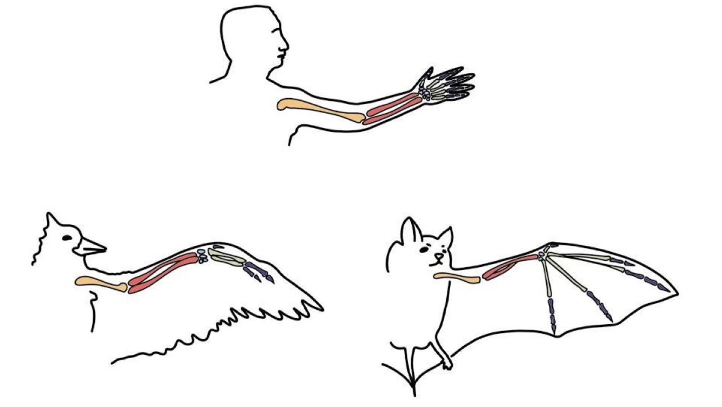 На рисунке изображено строение передней конечности у человека, летучей мыши и птицы. На основании строения конечностей можно утверждать, что