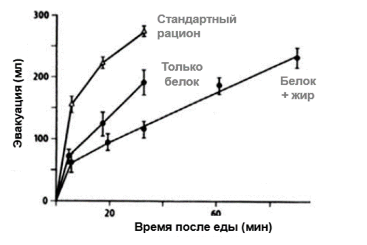 На рисунке изображён график зависимости объёма эвакуированного из желудка химуса от времени после еды для пищи разного состава.