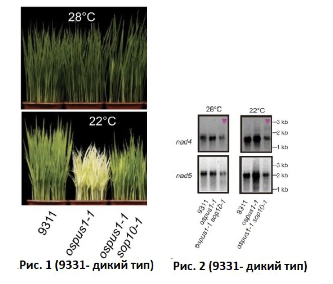Рис посевной (Oryza sativa L.) эволюционировал в тропических регионах, из-за этого стресс, вызванный холодом, сильно снижает урожайность риса. Используя методы молекулярной биологии, учёные задались целью создать сорт риса, который лучше растёт в холодных условиях. Ими был обнаружен мутант по гену хлоропластной псевдоуридинсинтазы, названный ospus1. Растения ospus1 при выращивании в низкой температуре (22 C) имели белый цвет (альбинизм). Далее учёные нашли мутанта sop10, который, будучи гомозиготой по ospus1, имел нормальный фенотип (рис.1). Учёные решили выяснить, чем вызван такой эффект. Оказалось, что sop10 несёт мутацию в гене SOP10, кодирующем белок, ответственный за экспрессию некоторых других генов. В результате мутации в гене SOP10 синтезируемый с него белок оказывается неактивным. Чтобы посмотреть, экспрессия каких генов меняется у мутантов sop10, учёные выполнили Нозерн-блот с мРНК генов nad4 и nad5 (рис. 2). Рассмотрите рисунки ниже и выберите верные утверждения.