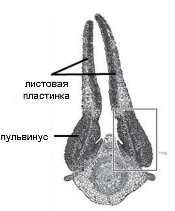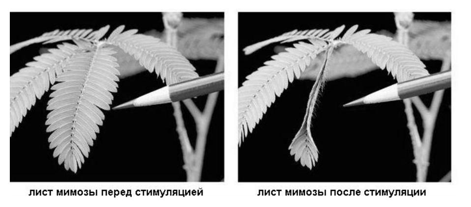 Механическое раздражение мимозы стыдливой вызывает быстрое (в течение 4-10 секунд) опускание листа. Это определяется изменениями размера клеток в пульвинусе, органе, расположенном у основания листа (см. рис).