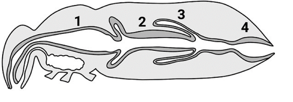 На рисунке изображено строение пищеварительной и выделительной системы насекомого. Выберите орган или структуру, в которой происходит наиболее интенсивная реабсорбция воды обратно в первичную полость тела.
